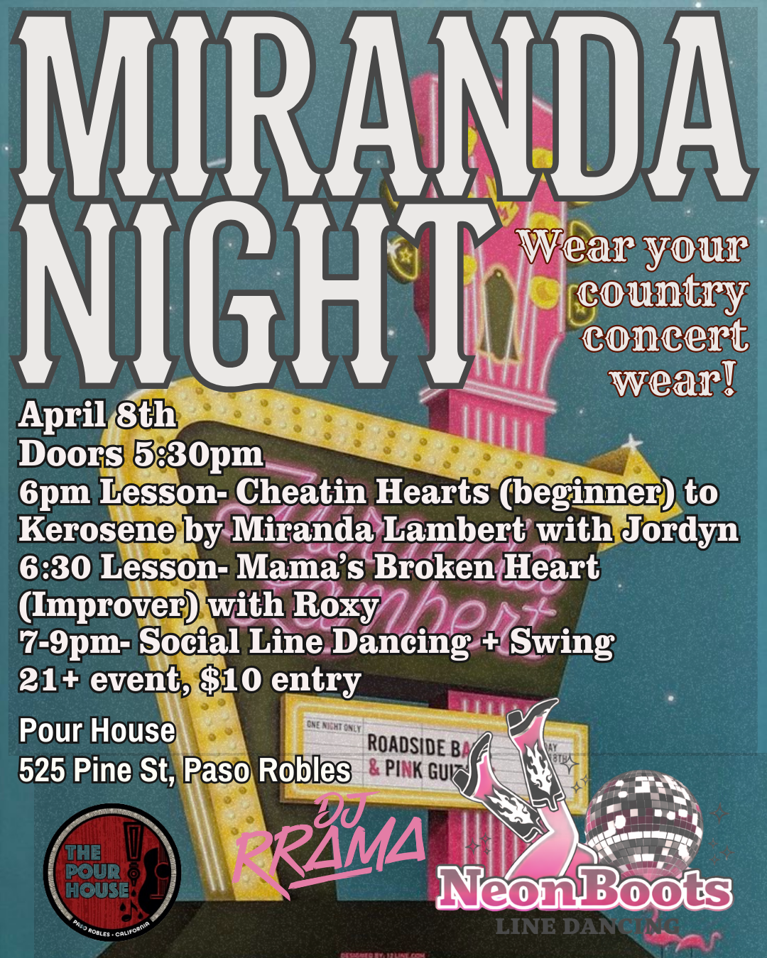 6-6:30pm “Kerosene” (beginner) with Roxy 6:30-7pm “Mama’s Broken Heart” (begin/inter) with Roxy